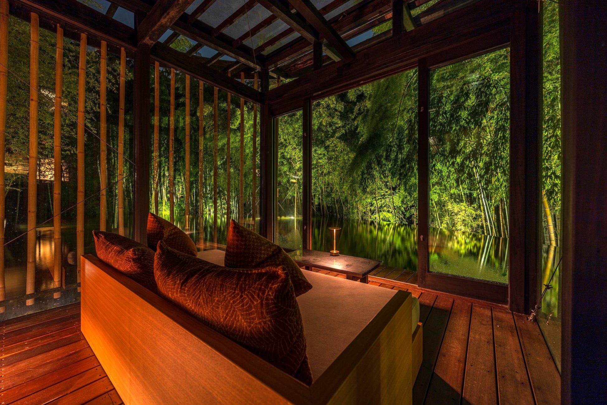 竹取物語をコンセプトにした「金乃竹 仙石原」は、“遊びを忘れない大人たちの隠れ宿”をテーマに、チェックインからチェックアウトまで他のお客様と顔を合わせることのないプライベートな滞在スタイルを提供しています。唯一のパブリックスペースである「Bar bamboo」では、照明を落とした落ち着いた空間の中で、お二人だけの特別な時間をお過ごしいただけます。テーブル席やカウンター、テラスに加え、2024年9月には完全貸切でご利用いただける「クリスタルルーム」も開設。水盤に浮かぶかのような室内からは、竹取物語を思わせる竹林を一望でき、幻想的な時間をお過ごしいただけます。