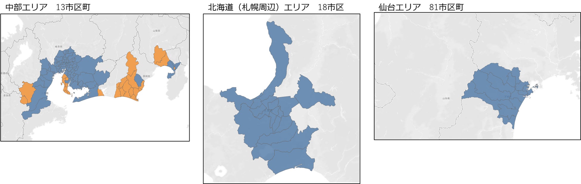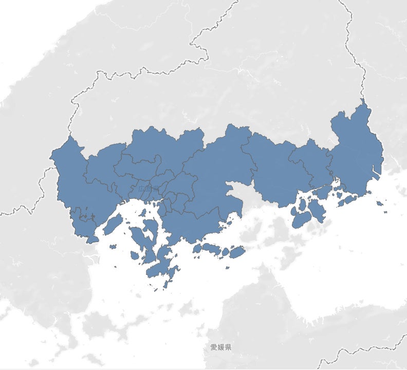 広島県:広島市中区、広島市東区、広島市南区、広島市西区、広島市安佐南区、広島市安佐北区、広島市安芸区、広島市佐伯区、呉市、三原市、尾道市、福山市、大竹市、東広島市、江田島市、廿日市市、府中町、海田町、熊野町、坂町