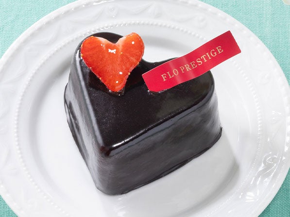 軽めのショコラミルクムース、スポンジ、パッションフルーツジュレを重ね、グラサージュショコラをかけて、ハート型にした苺をトッピングしました。