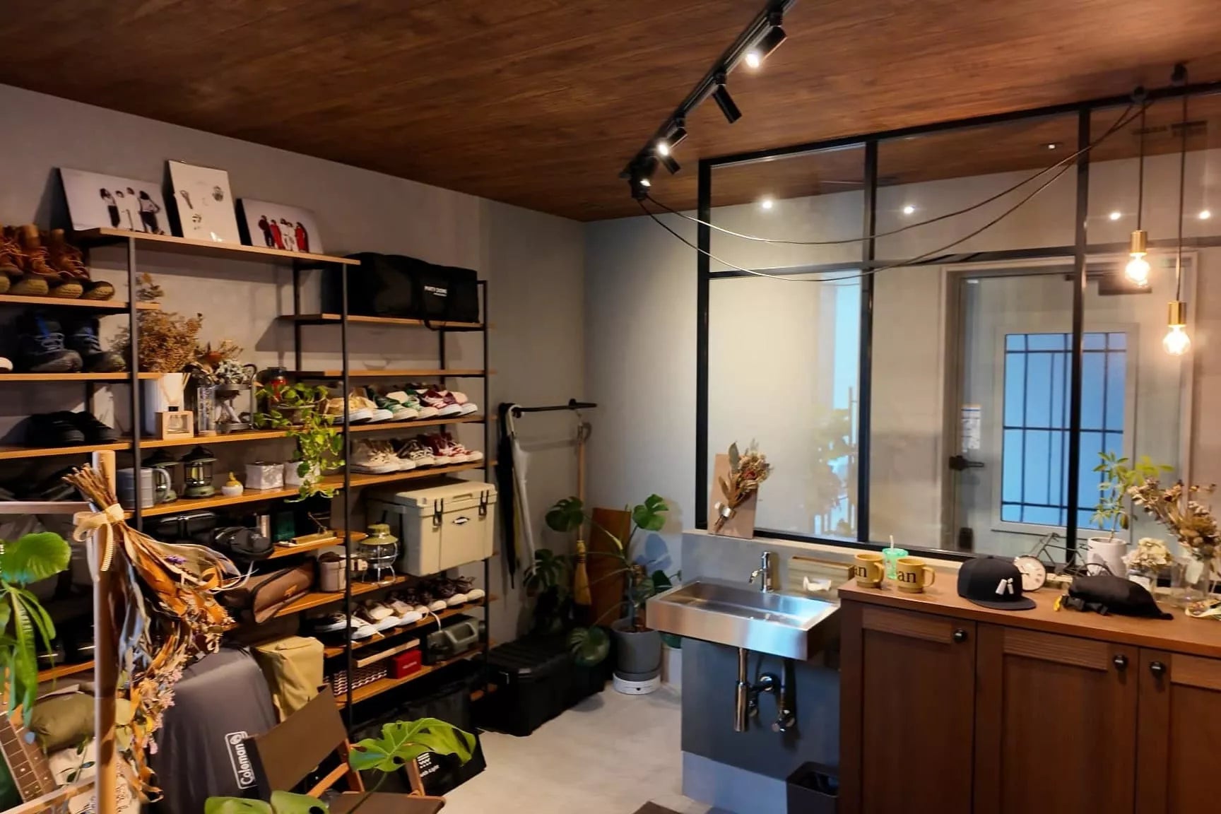 約7畳という余裕のある広さを取った玄関土間は、見せる収納にしてまるでお店のディスプレイのようなおしゃれ空間に仕上げました。玄関ドアの前はガラスで仕切ることで空間を緩やかに分けつつ、開放的な印象はそのままにしています。