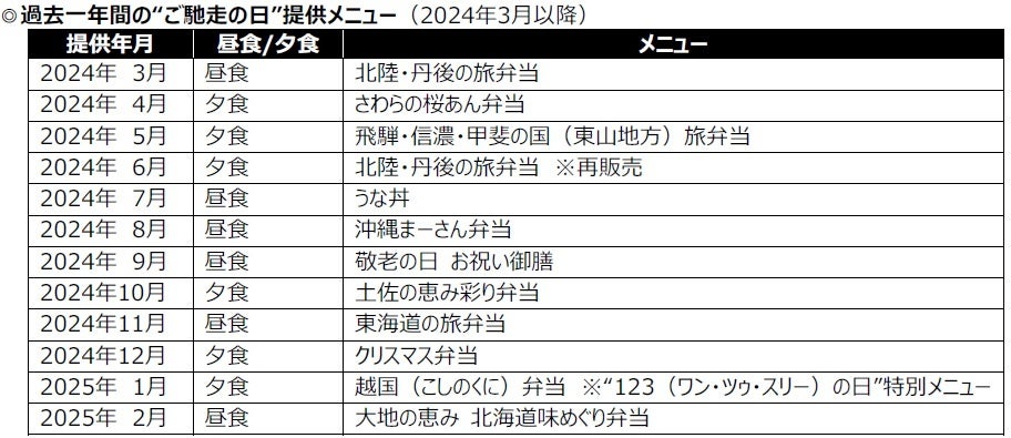 当社では、栄養バランスが整った食事を摂ることによる“体の栄養”に加え、“心の栄養”につながる取り組みとして、“ご馳走の日”を月に1回設けています。“ご馳走の日”には、各地域の食材やご当地メニューなどを取り入れた特別メニューを、通常のお弁当(普通食)と同じ577円(税込・おかずのみ)で提供。普段はなかなか食べる機会の少ない食材やメニューで、利用者が届くまでの待ち遠しさや誰かに自慢したくなる気持ちを感じられるお弁当になるよう心掛けています。