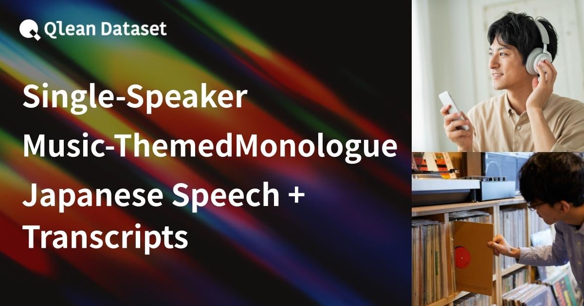 本データセットは、Qlean Datasetが展開する機械学習用データセットラインナップ『AIデータレシピ』に新たに加わるもので、音楽やアーティスト、楽曲、音楽体験などをテーマに、日本人の話者が一人語り形式で語る日本語音声と、その発話内容を忠実に書き起こしたトランスクリプトを収録しています。作品やアーティストへの考察、音楽にまつわる体験談、ジャンルや時代背景に関する解説など、音楽領域に即した話題が連続的な発話として展開されます。