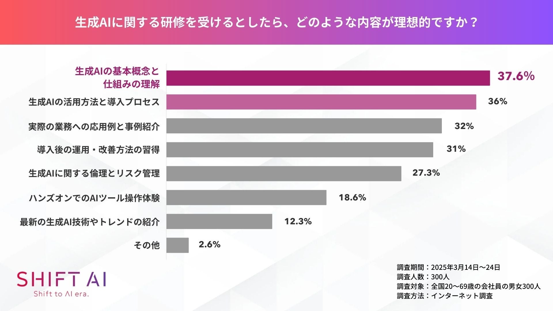 生成AIに関する研修を受ける場合、どのような内容が理想的かを聞いたところ、「生成AIの基本概念と仕組みの理解(37.6%)」が最も多い回答となり、まずはAIの動作原理や基本的な概念を知ることが重要視されていることが分かりました。合わせて「生成AI活用方法とプロセス(36%)」「実際の業務への応用例と事例紹介(32%)」も上位の回答となり、実際の業務でどのようにAIを導入し活用するのか、具体的な手順の理解や成功事例を学び、業務にどのように適用できるかを把握したいというニーズが高まっていることがわかりました。