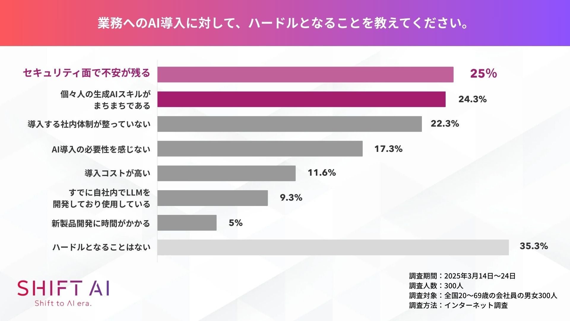 業務へのAI導入に対して、ハードルとなることについて聞いたところ、「セキュリティ面で不安が残る(25%)」が最も多い結果となり、背景に企業の機密情報や個人データの流出リスクが懸念されていることが明らかとなりました。そのほか「個々人の生成AIスキルがまちまちである(24.3%)」「導入する社内制度が整っていない(22.3%)」等の回答が上位となり、企業内でのスキルギャップや社内制度の構築に時間を要すると考えられていることが、企業におけるAI導入の足かせになっていることが分かりました。