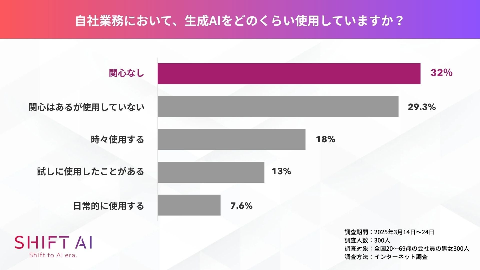 「日本をAI先進国に」を掲げAIのビジネス活用を学べる利用者数No.1※のAI大学「SHIFT AI」を運営する株式会社SHIFT AI(東京都渋谷区、代表取締役 木内翔大、以下 当社 )は、全国の会社員の男女25〜69歳の300名を対象に、業務におけるAI活用実態調査を実施しました。
