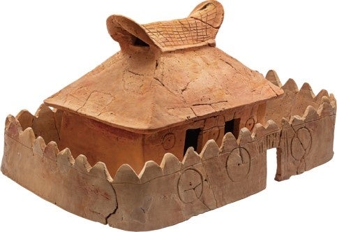 中でも、熊本県上官塚遺跡の円墳周濠から出土した家形埴輪と囲形埴輪は、鏡を表していると考えられる円文が描かれた非常に珍しいものです。