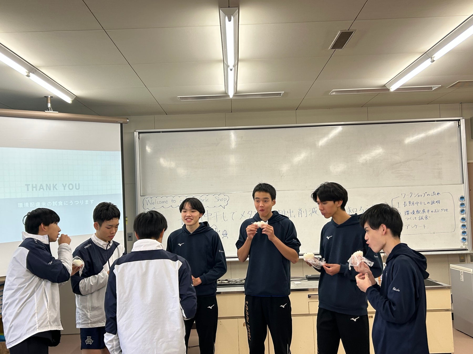 環境配慮米を活用したおにぎりを生徒が試食し、環境問題の理解を深める