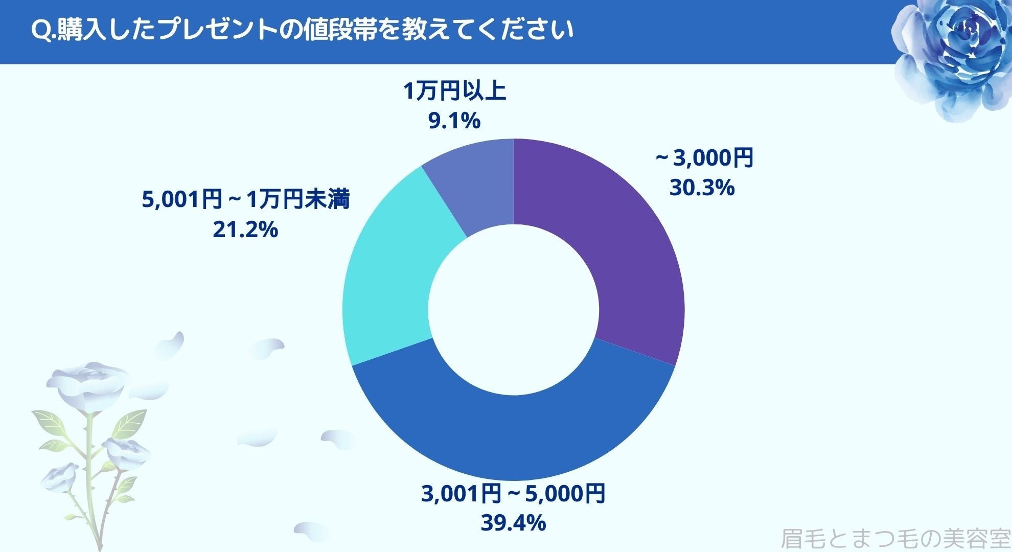 購入したプレゼントの値段帯をお聞きしたところ「~3,000円(30.3%)」、「3,001円~5,000円(39.4%)」、「5,001円~1万円未満(21.2%)」、「1万円以上(9.1%)」という結果になりました。