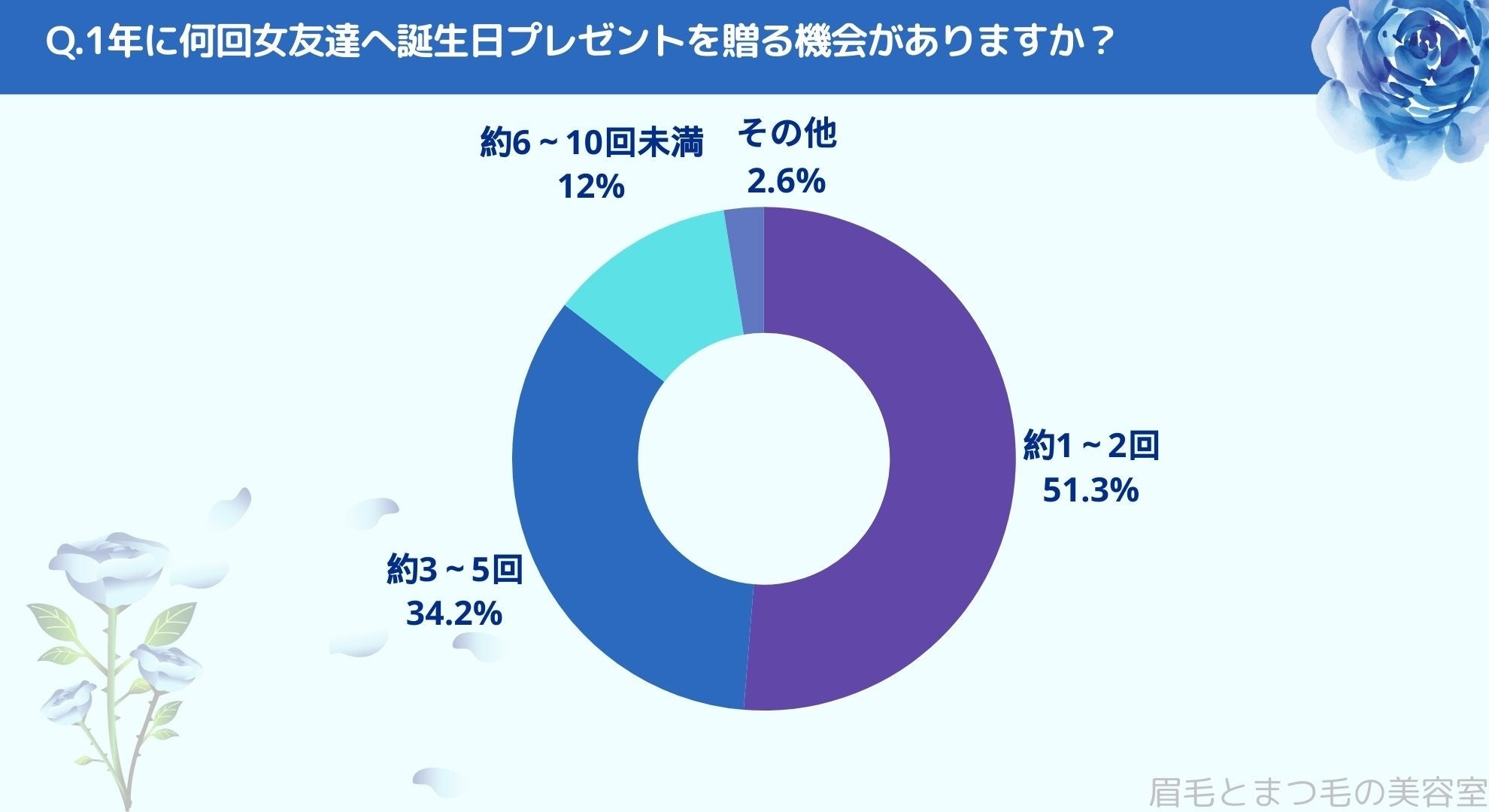 1年に何回、女友達に誕生日プレゼントを贈る機会があるかお聞きしたところ「約1~2回(51.3%)」、「約3~5回(34.2%)」、「約6~10回未満」、「その他(2.6%)」という結果になりました。