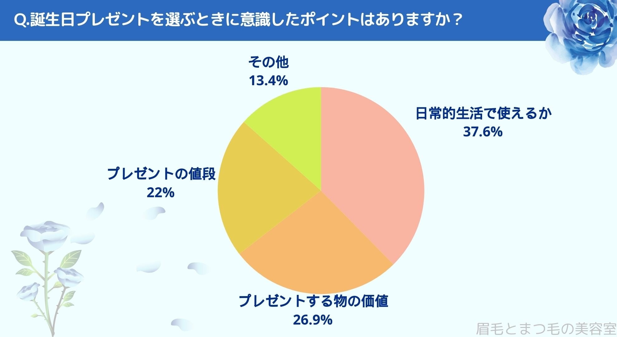 誕生日プレゼントを選ぶときに意識したポイントをお聞きしたところ「日常生活で使えるか(37.6%)」、「プレゼントする物の価値(26.9%)」、「プレゼントの値段(22%)」、「その他(13.4%)」という結果になりました。