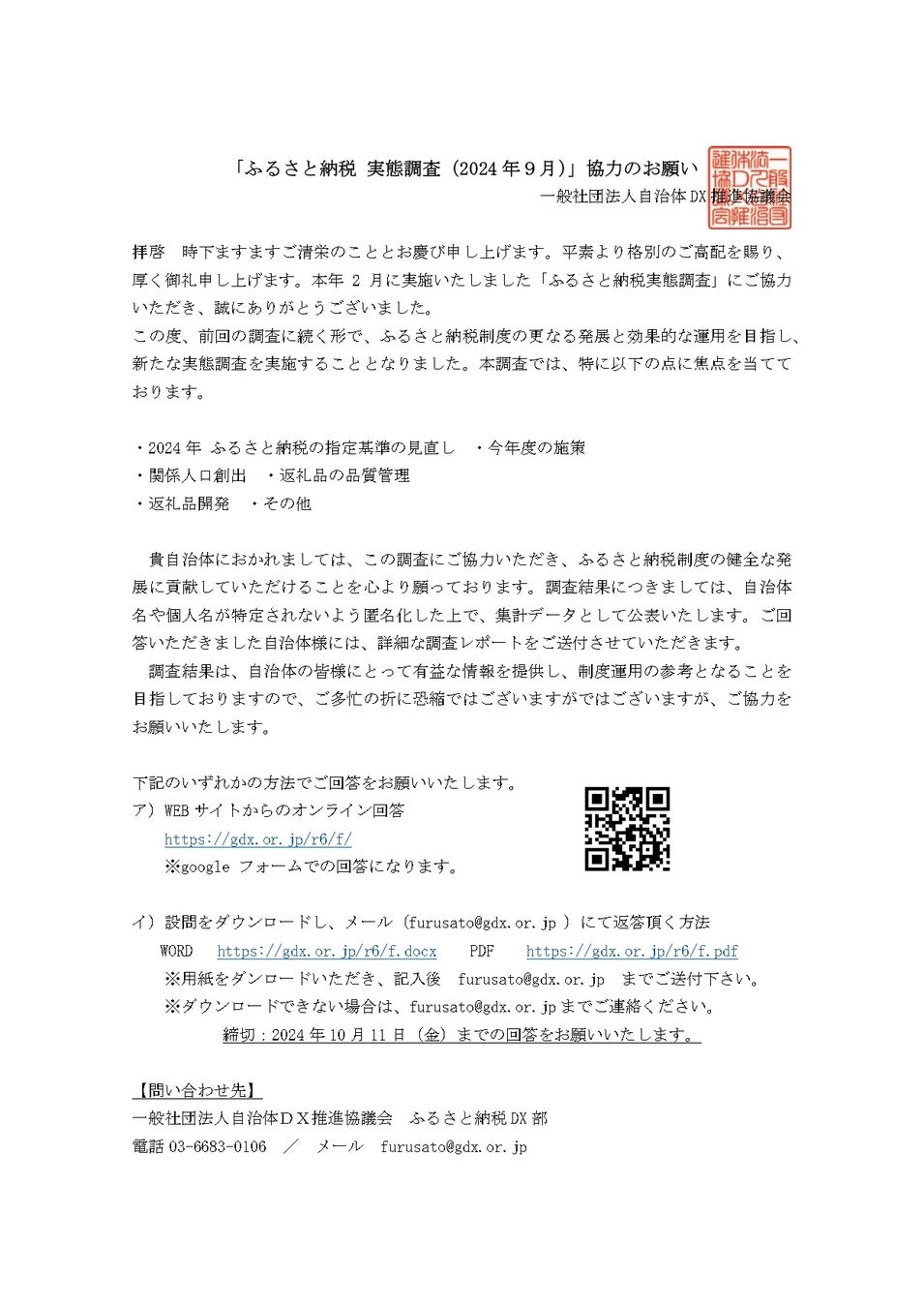 自治体向け「ふるさと納税 実態調査(2024年9月)」 ― 回答期間延長のお知らせ / 一般社団法人自治体DX推進協議会 ふるさと納税DX部