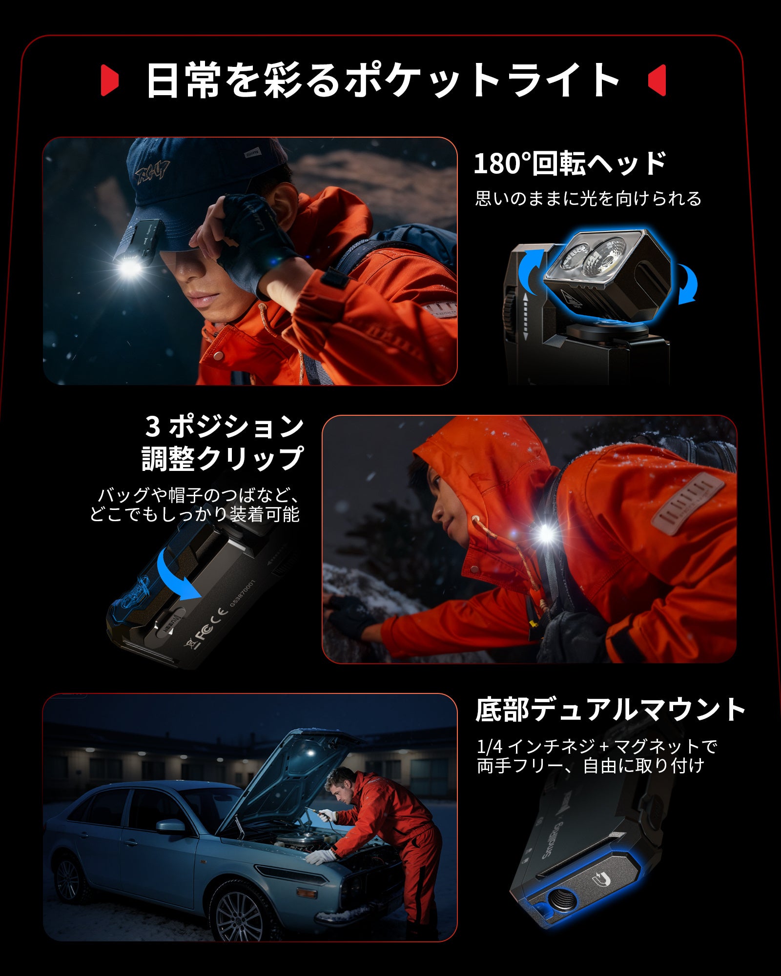 180°回転可能なライトヘッドと3方向調整クリップにより、バックパックや帽子、テーブルなどさまざまな場所に取り付け可能。底部には1/4インチねじ穴と磁力マウントを装備し、アームや標準アクセサリーに接続してハンズフリーで使用できます。側面スイッチとロック機能で誤操作も防止。