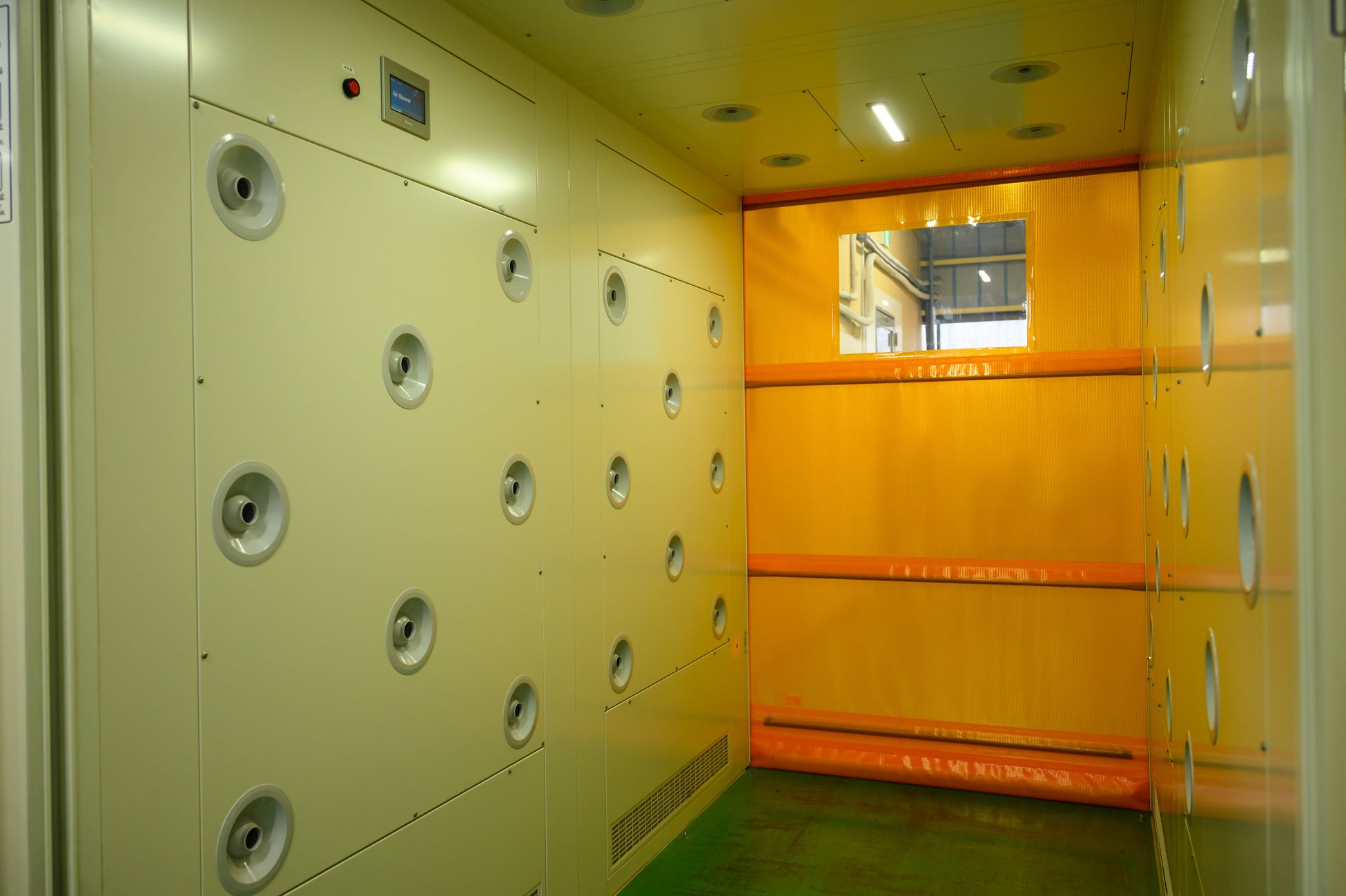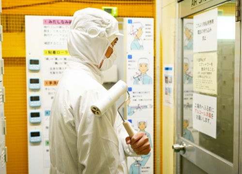 『東京パック』では高い清浄度を維持する特殊なエリアである『クリーンブース』を併設しています。ここでは特に安全性が求められる食品トレイや、医療現場で使用される各種容器を製造しています。工場入口にエアーシャワーを装備。工場内は高効率なフィルターを備えた加圧空調システムにより、室外よりも高圧にし、ホコリの侵入を防ぎます。また金属検知器や除塵機を設置し、清浄な環境で作業や製造を行えるように設計。入室についても、クリーンブースに異物を持ち込まないよう対策が徹底されています。