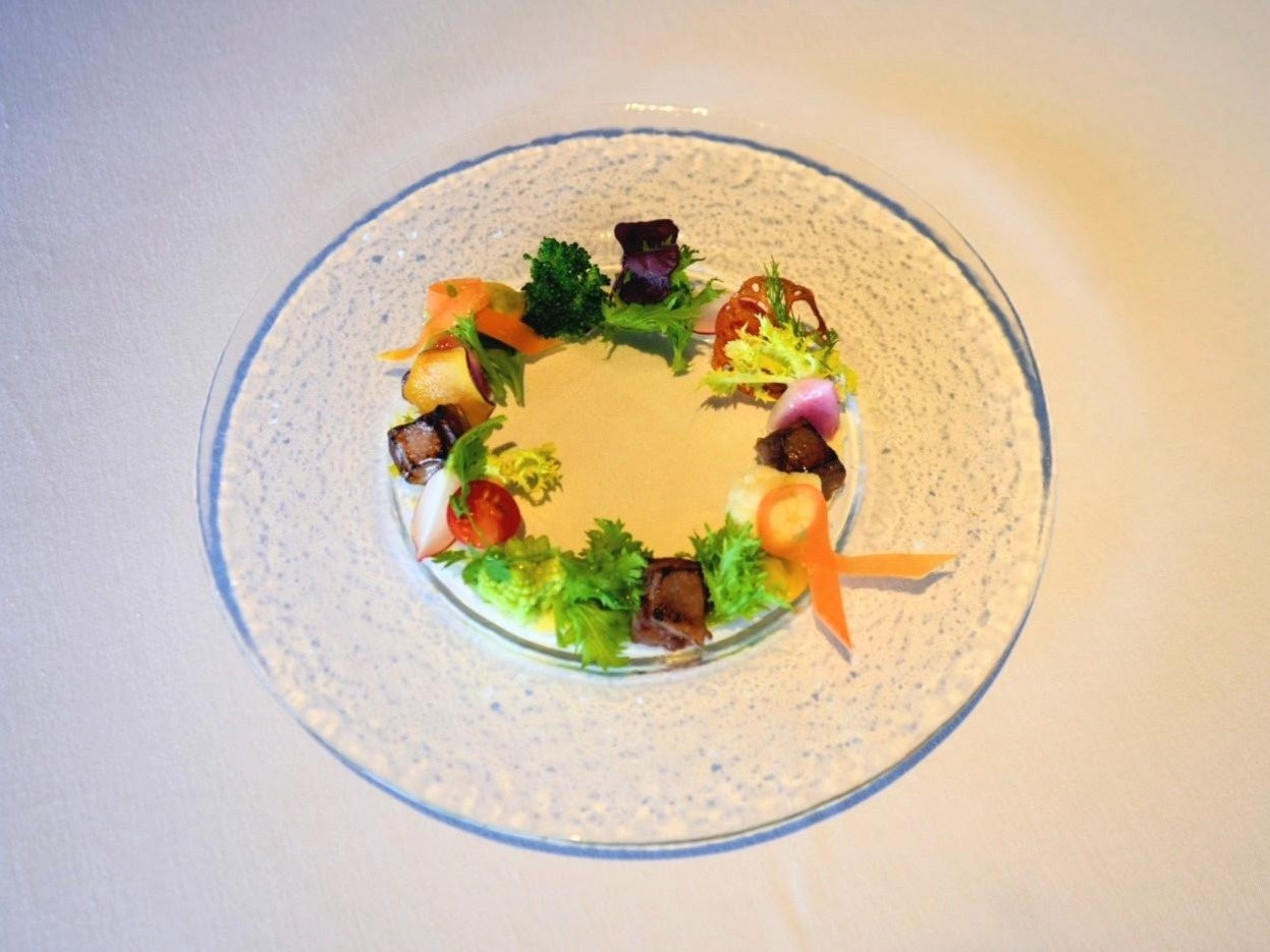○アミューズ:冬野菜のポタージュ ○前菜:飯綱町産鴨もも肉のコンフィ リースに見立てたサラダ仕立て ○魚料理:平目のパイ包み焼き サフランソースと竹炭のソース ○肉料理:国産牛ほほ肉の赤ワイン煮込み ○デザート:フォンダン・ショコラ ミルクジェラート添え の5品 |