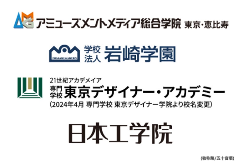アミューズメントメディア総合学院、岩崎学園(横浜デジタルアーツ専門学校・横浜fカレッジ)、専門学校東京デザイナー・アカデミー、日本工学院(日本工学院専門学校・日本工学院八王子専門学校)