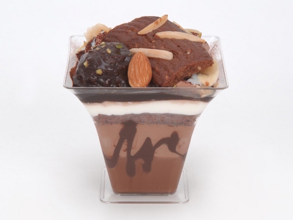 濃厚なベルギーチョコプリンとムースを組み合わせたベースの上には、香ばしく焼き上げた自家製ココアクッキーとチョコケーキ、アーモンドやピスタチオ、ナッツ入りチョコクリームをトッピング。アーモンドスライスとチョコクリームを混ぜ込んだチョコクリームや艶のあるチョコとホワイトのWチョコソースを載せました。チョコソースで線を描いたカップも特徴です。