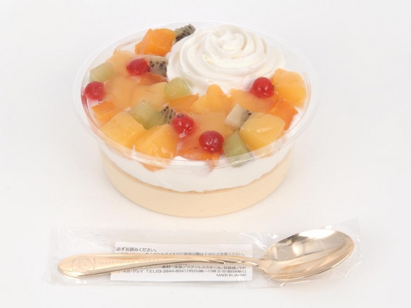 HAPPYRICH SWEETSのロゴマーク入りスプーンをつけ、数量限定で発売します。北海道牛乳入りのカスタードムースとスポンジを組み合わせたベースに、クリーミーな北海道産ホイップクリームを載せました。その上には、マンゴー、キウイ、黄桃の3種類のダイスカットされたフルーツを全面に敷き詰め、赤スグリを華やかにトッピングしました。