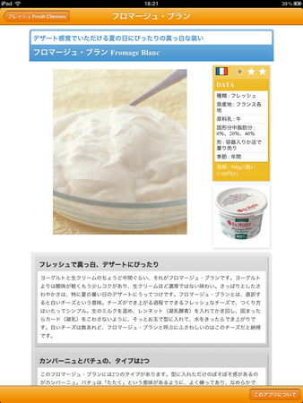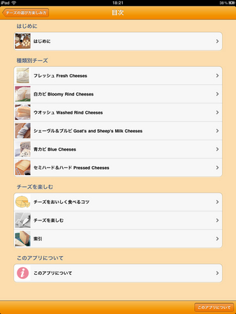 本アプリは、主婦の友社より好評発売中の書籍『チーズの選び方・楽しみ方』の内容をベースに、iPhoneやiPadなどのiOS端末や、スマートフォン、タブレットなどAndroid端末で閲覧するために最適化したアプリ。トップページからタップしていくだけで、チーズの種類や名前から簡単に目的のチーズについて調べることができます。