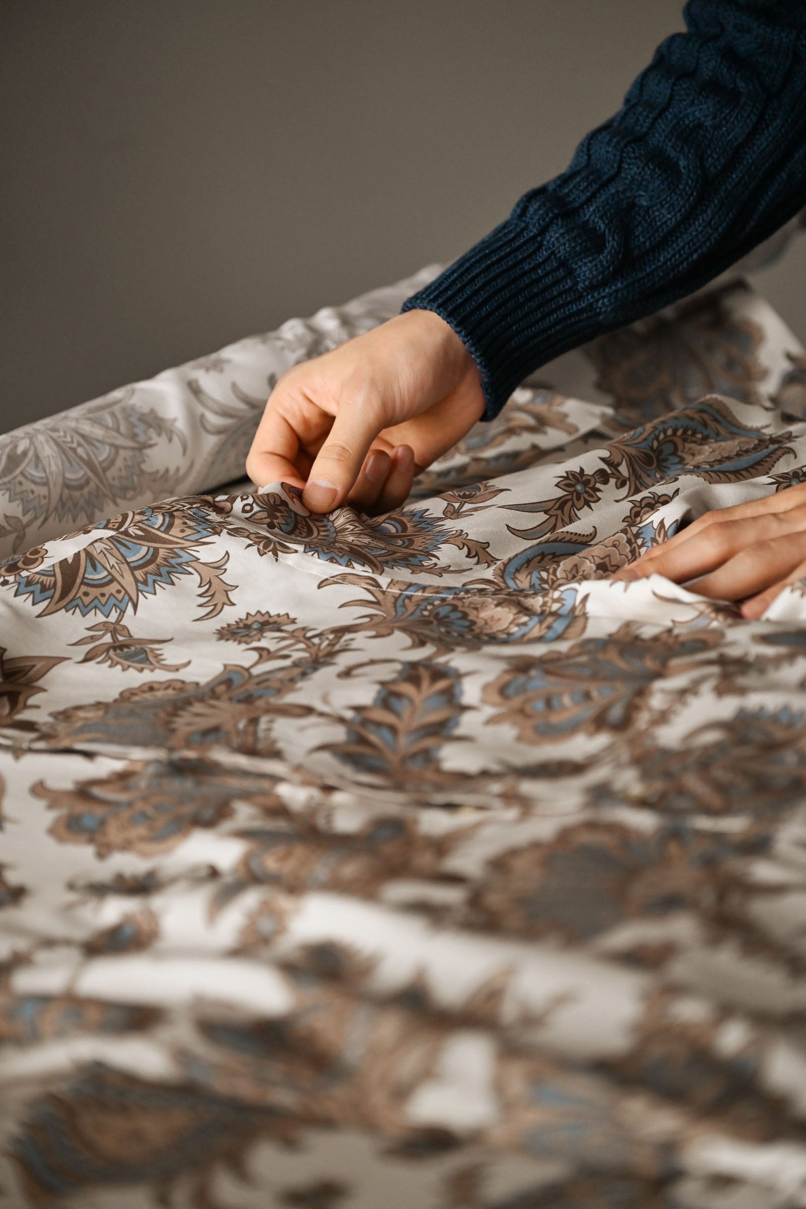 エトロは、世界各地の文化や風土からインスピレーションを得た巧みなファブリックデザインで知られています。テーマごとに厳選された生地が並ぶファブリックルームは、ブランドの創造の源泉ともいえる場所。アイコニックなペイズリー柄は、シルクやカシミアなどの贅沢な素材に美しく表現され、そのクラフツマンシップによって、シャツやショールといった洗練されたアイテムへと仕立てられます。厳選されたファブリックを高度な技術で巧みに融合させ、デザインやパターンの美しさを最大限に引き出す——まさに、テキスタイルが生み出すアートです。