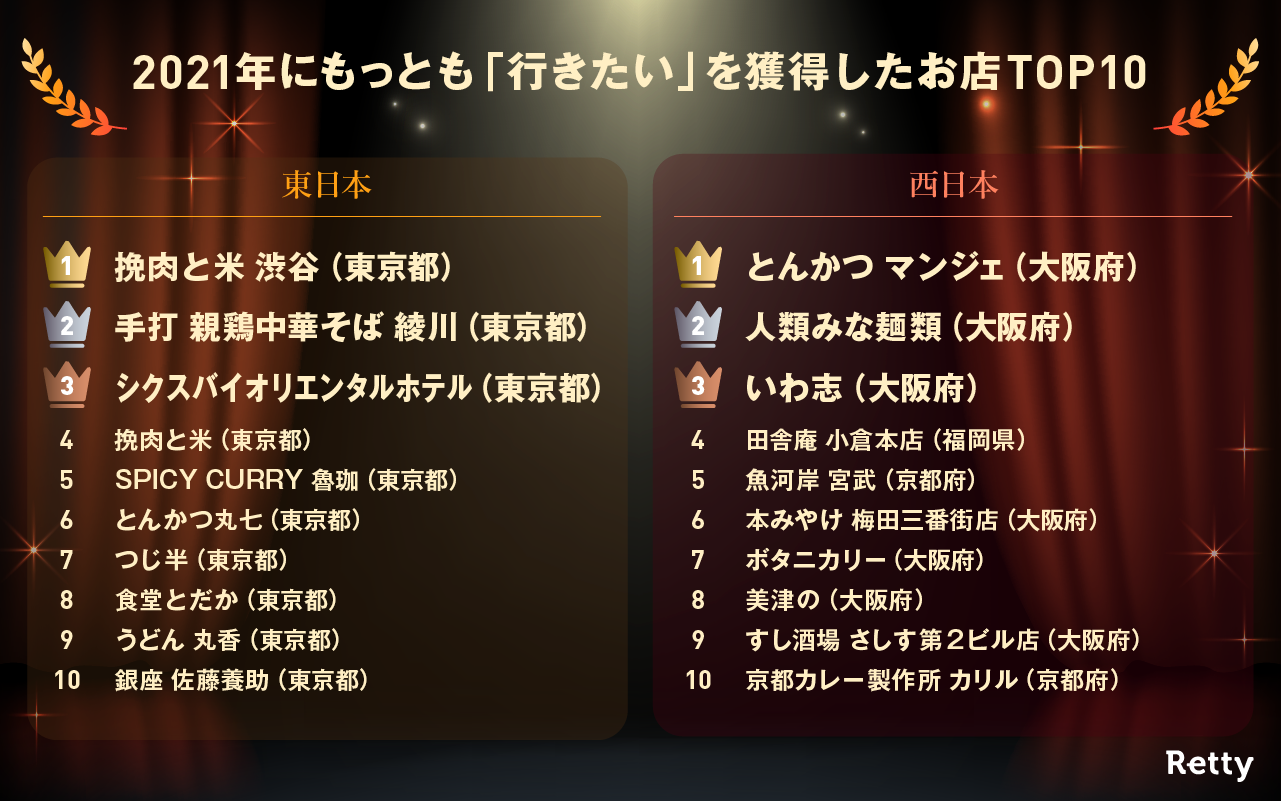 2021年、グルメなRettyユーザーから「行きたい」を獲得したお店TOP10を東日本と西日本に分けて紹介します。(※5)長らく多くの方に愛されているお店から、オープン1年以内の「話題の新店」までランクインしております。