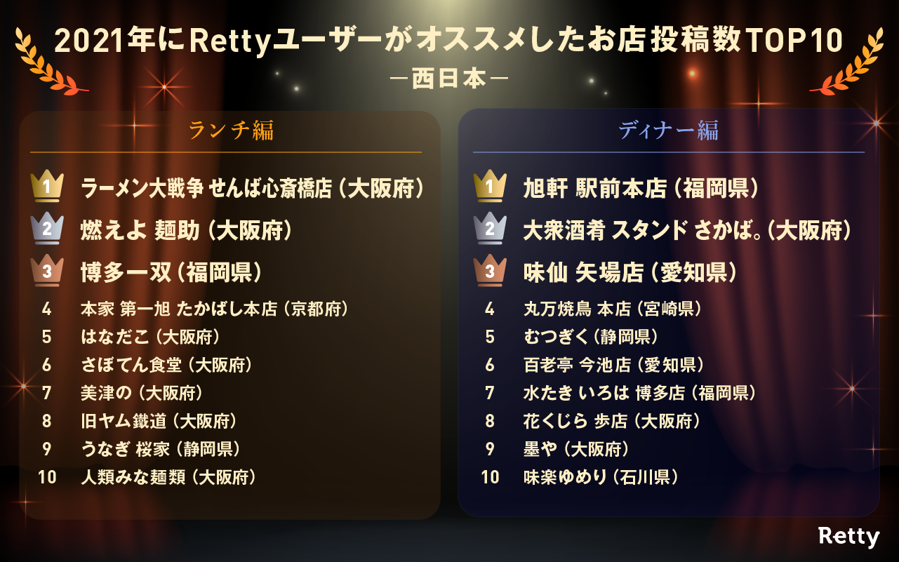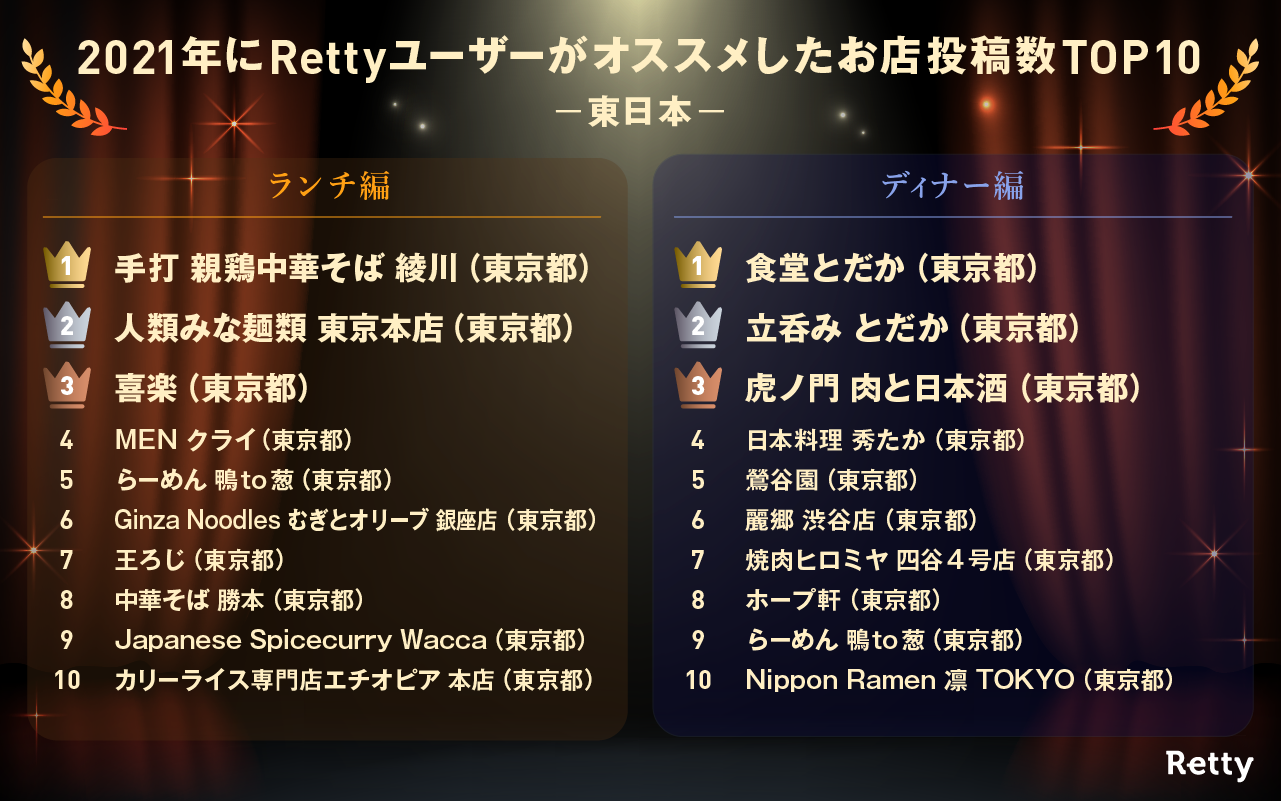 2021年、グルメなRettyユーザーがオススメしたお店の投稿数TOP10をランチ、ディナーそれぞれ東日本と西日本に分けて紹介します。(※3)(※4)