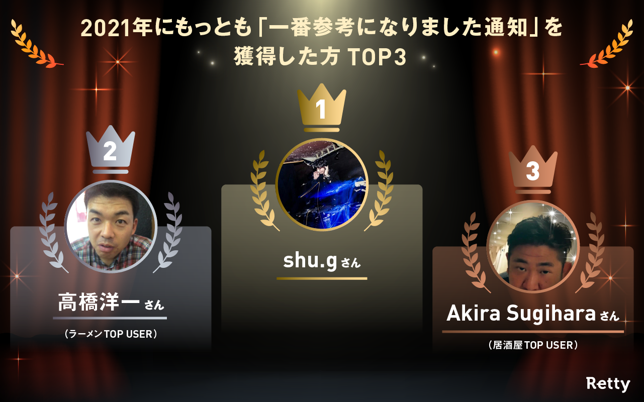 2021年、Rettyへの投稿にもっとも「一番参考になりました通知」(※2)を獲得した方は下記3名のユーザーさんです!(※1)
