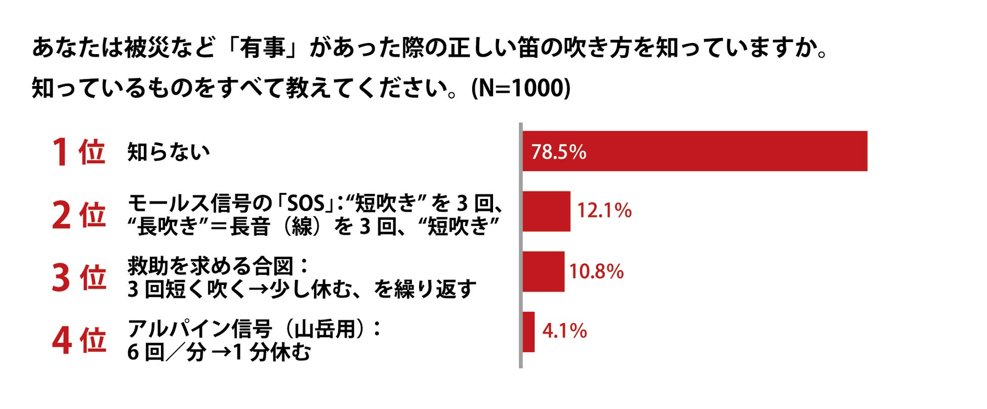 調査では78.5%の人は「正しいホイッスルの吹き方を知らない」と回答しました。災害時に役立つホイッスルの吹き方はモールス信号の「SOS」が一般的です。
