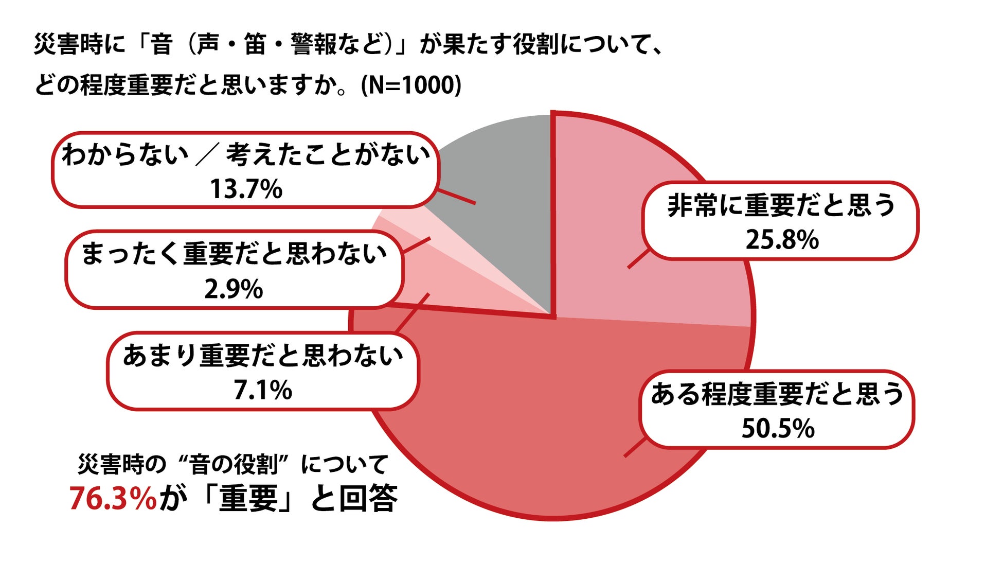 また、「想定はするが対策はしていない(29.3%)」「想定しているが、どのように対策すれば良いかわからない(22.7%)」が半数以上を占め、必要性は感じていても行動に移せていない層が多いことが示されました。一方で、災害時の“音の役割”については76.3%が「重要」と回答しており、音の必要性そのものは広く理解されています。つまり、音が重要だと認識していても、備えとして形になりにくいというギャップが存在しています。