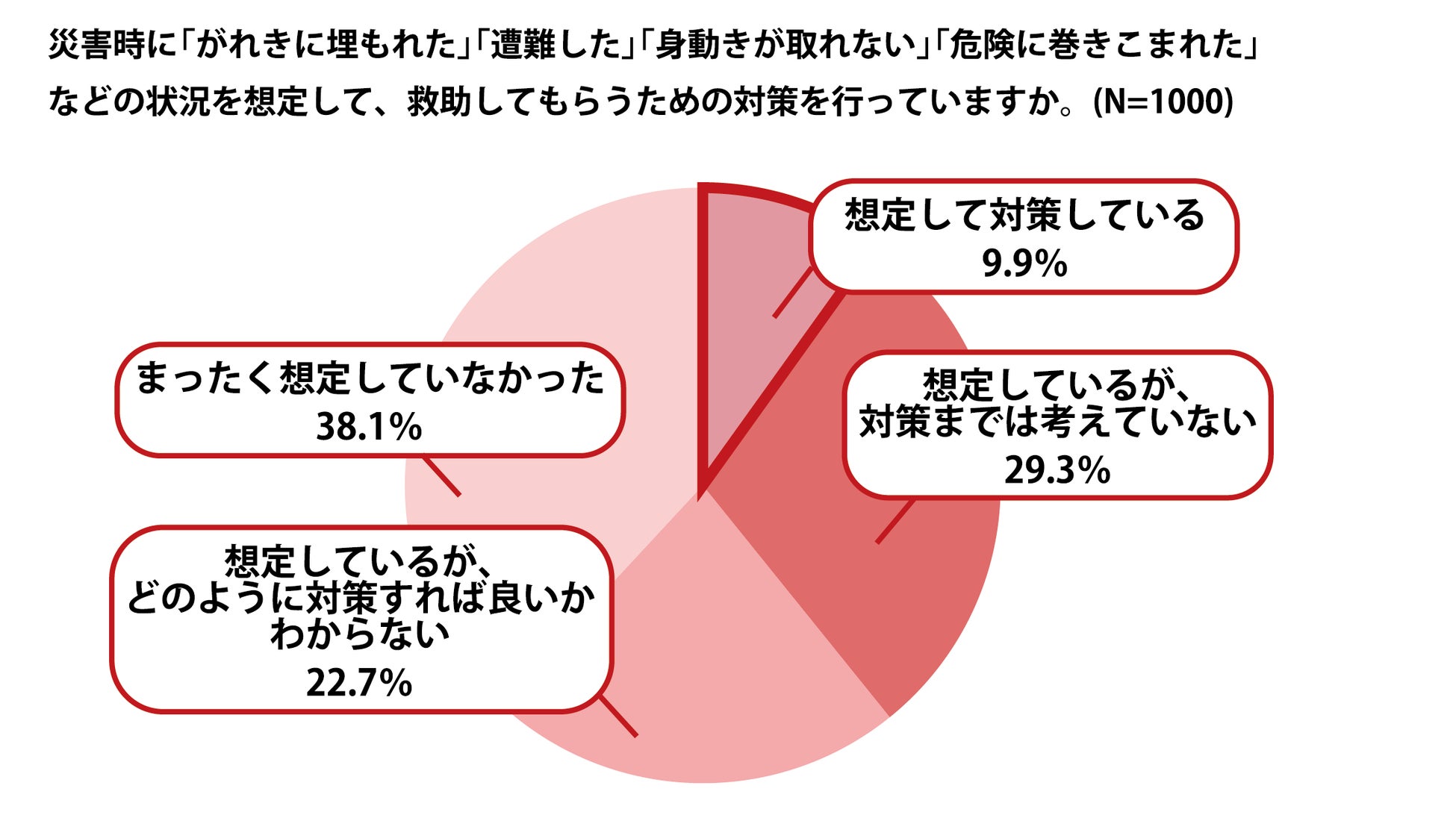 “音の出るもの”の準備率(17.1%)が最も低かった背景には、対策方法がわからないなど、災害時に自分が助けを求める状況を思い描くことそのものが難しいという課題が見えてきます。実際「がれきに埋もれる」「身動きが取れない」など状況を想定して具体的な対策を行っている人は 9.9% にとどまりました。