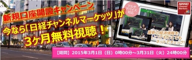 当社では2015年3月1日(日)より新規に口座開設頂いたお客様を対象に、「日経チャンネルマーケッツ」が最大で3ヶ月間無料で視聴頂けるキャンペーンを実施いたします。