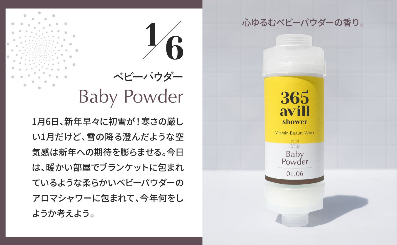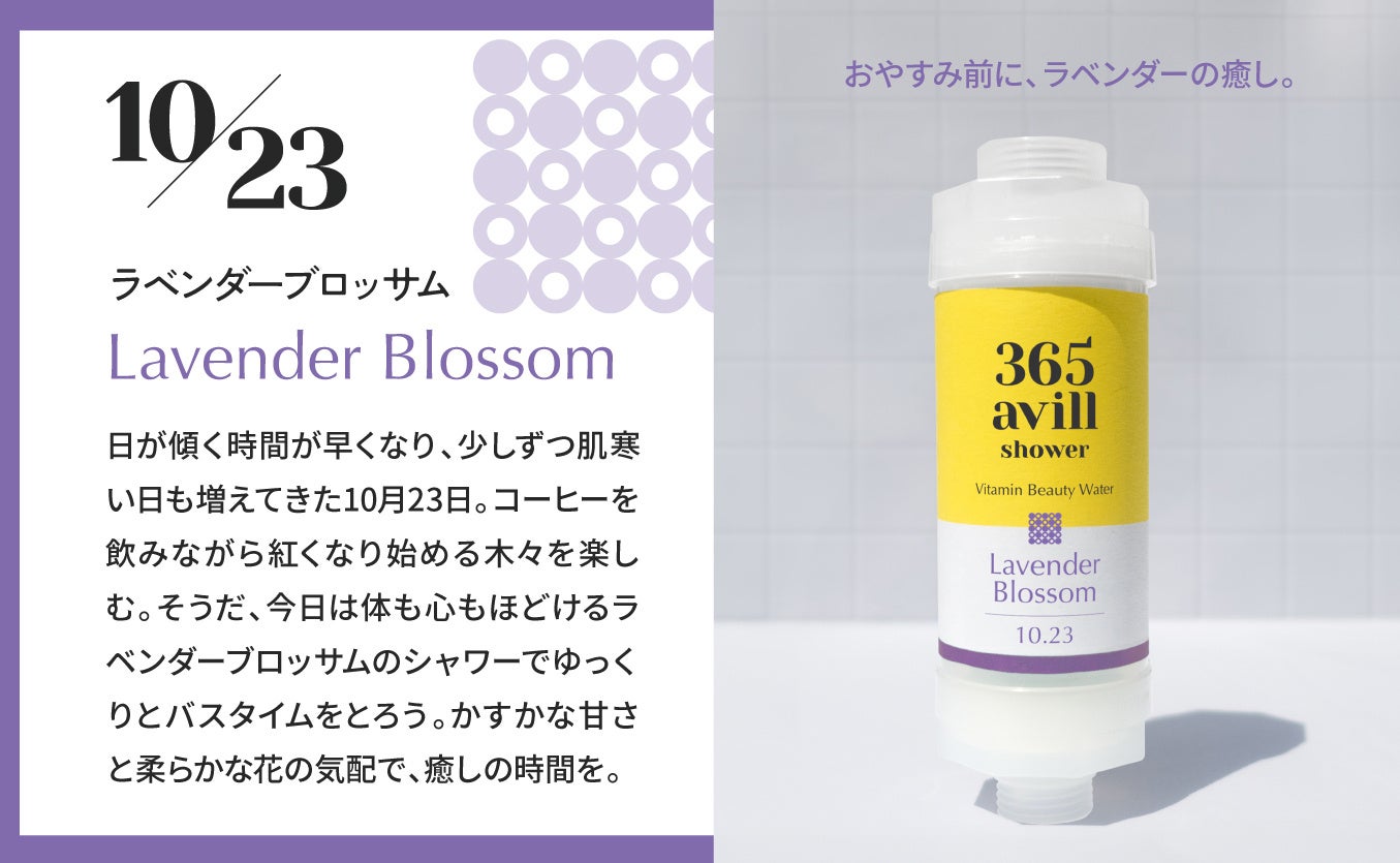 「365avill」は、香りごとに季節やシーンをイメージしたストーリーが込められているのも特徴のひとつです。 その日の気分や過ごし方にあわせて選ぶことができ、毎日のシャワータイムをより心地よい時間に演出してくれます。