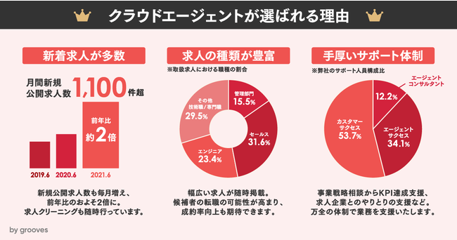 「はたらくヒトと、未来を拓く。」をビジョンに掲げる株式会社grooves(グルーヴス 本社:東京都港区 代表取締役:池見 幸浩)は、総合満足度No.1 求人データベース「Crowd Agent(クラウドエージェント、https://pr.crowd-agent.com/)」を利用する全ての人材紹介会社を対象とした、総額500万円の大型キャッシュバックキャンペーンを2022年1月25日より実施しています。キャンペーン好評につき、キャッシュバック総額を2倍の1,000万円に増額したことをお知らせいたします。