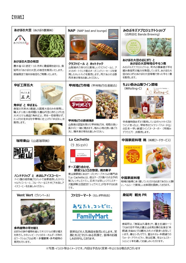 身延町の「あけぼの大豆」の枝豆をはじめ、クラフトビール、ワイン、甲州地どり惣菜、中国家庭料理、コーヒー、チーズ、ソフトドリンク、観葉・多肉植物、身延町特産品などをご用意しています。