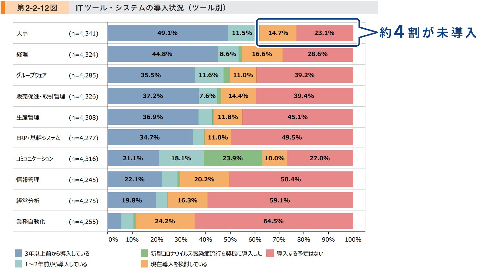 一方、我が国の状況として、コロナ禍で中小企業のデジタル化は進んでいるものの、依然として、約4割の中小企業で、人事関連(勤怠管理、給与計算等)のITツールの導入ができていない という状況が見られます。