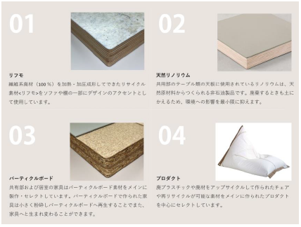 本物件では、主に4つの素材を用いた家具を選定いたしました。1つ目は、リフモという繊維系廃材(100%)を加熱・加圧成型してできたリサイクル素材です。それを共用部のソファや棚の一部にデザインのアクセントにしました。2つ目は、天然リノリウムです。これは、天然原材料から作られる非石油製品で、廃棄する時は土にかえるため、環境への影響を最小限に抑えられます。主に共用部のテーブル類に使用しました。3つ目は、間伐材や建築廃材を用いた国内産のパーティクルボードです。共用・専有部の家具には、この素材を採用し製作しました。4つ目は、アップサイクルのビーンバックです。廃棄された船のセイルを 素材としました。