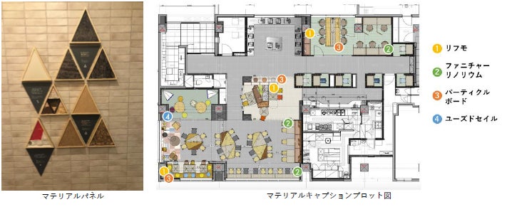 また、学生が使用しているそれぞれの家具が、どのような素材から生まれた家具であるのかをイメージしやすいように、原材料からの加工工程をキャプションで説明し、加工する前の材を段階的に展示しております。2022年に竣工した「キャンパスヴィレッジ大阪近大前」においても、1階の共用部に入居者が日々の生活の中で循環型経済「サーキュラーエ コノミー」を身近に感じ、学ぶことができるような空間作りを行うなど、学生 レジデンス「 CAMPUS VILLAGE(キャンパスヴィレッジ)」シリーズでは、入居学生が環境取り組みを学ぶきっかけになるようような仕掛けを積極的に提供しております。