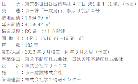東急不動産株式会社(本社:東京都 渋谷区、代表取締役社長:岡田 正志、以下「東急不動産」)と日鉄興和不動産株式会社(本社:東京都港区、代表取締役社長:今泉 泰彦、以下「日鉄興和不動産」)、株式会社学生情報センター(本社:京都府京都市、代表取締役社長:吉浦 勝博)は、東急不動産が開発し学生情報センターが運営する学生レジデンス「CAMPUS VILLAGE(キャンパスヴィレッジ)」シリーズの「キャンパスヴィレッジ千歳烏山」(以下「本物件」)がこの度竣工したことをお知らせいたします。