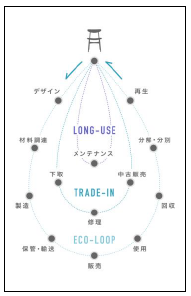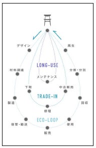 本物件に納品した家具の使用後は、アクタスが構築した、家具版のサーキュラーエコノミー「廃棄される家具をなくす 3つの循環システム」に則ってリペア、リユース、リサイクルされます。この3つの循環システムは、①長期使用のための家具の修理サービス、②無駄な廃棄をなくすための家具の買い取り、修理、再販システム、③回収した古家具のマテリアルリサイクルと木部の家具への再生=エコループ、によって構成されています。