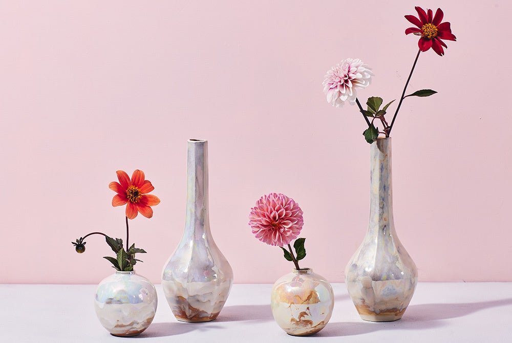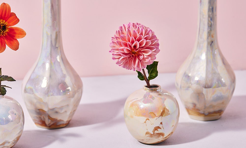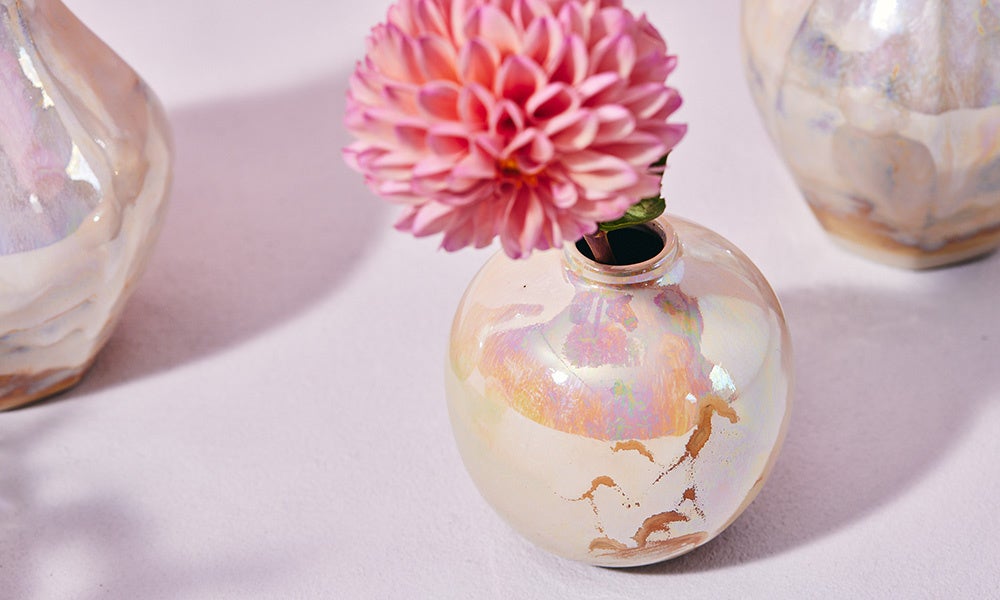 中でも注目は、オーロラの釉薬を使用したフラワーベース。真珠のような輝きと結晶が出ることが特徴で、光の加減によっても見え方が異なる不思議な色彩です。箇所によって見える色が異なるので、向きを変えることで違った雰囲気を楽しめます。
