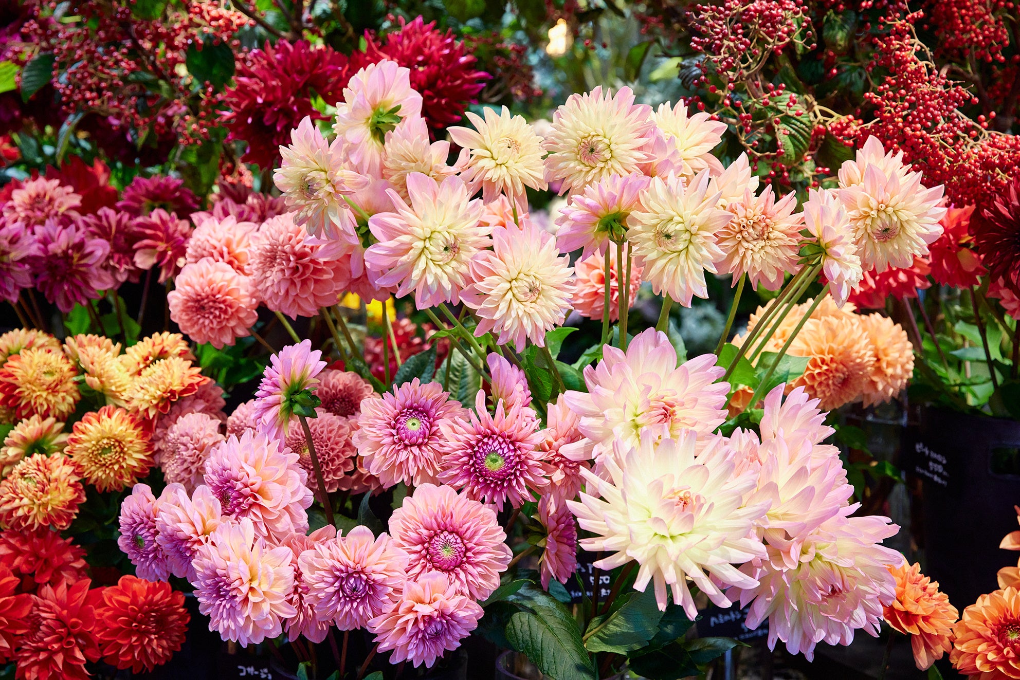 顔が隠れるほどの巨大輪から小ぶりのマイクロポンポンまでサイズも豊富に、店内いっぱいに多彩なダリアをご用意いたします。