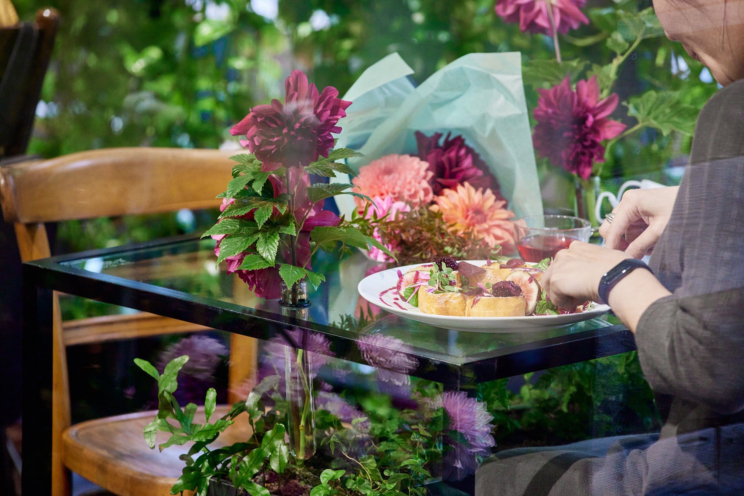 緑に囲まれた癒し空間で過ごす、金曜夜に開催するフラワースクール ハナキチとカフェ・グリーンハウスとのコラボレッスンイベントも開催します。ダリアに囲まれた店内でエディブルフラワーが載ったスイーツをお召し上がりいただきながら、花について学べる人気のイベントです。