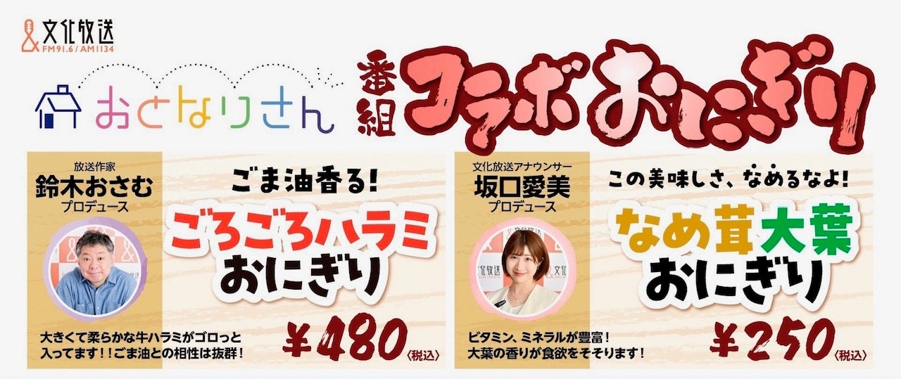 水曜パーソナリティ鈴木おさむがプロデュースした「ごま油香る!ごろごろハラミおにぎり」は、大きくて柔らかなハラミがごろっと入って、ごま油とお肉の相性が抜群のおにぎりです。坂口愛美アナウンサーがプロデュースした「この美味しさ、なめるなよ!なめ茸大葉おにぎり」は、大葉の香りとなめ茸が絶妙にマッチしていて、大人の美味しさを味わえます。