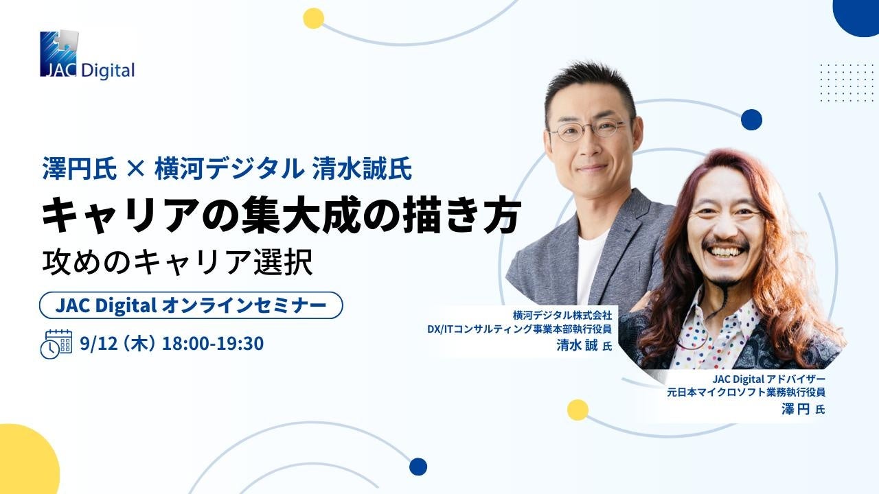 本セミナーでは、JAC Digitalアドバイザーであり元日本マイクロソフト業務執行役員の澤円氏に加え、長年勤めた大企業を出て、コンサルファーム「横河デジタル株式会社」の創業メンバーとして参画した清水氏が登壇。「攻めのキャリア選択」について語ります。