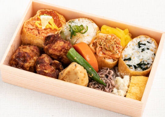 彩りいなり にじなり|彩りいなり4種と鶏の唐揚げのおばんざい弁当 1,080円(税込)