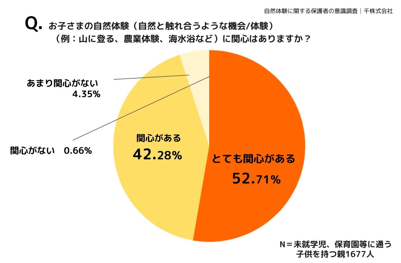 子どもの自然体験(自然と触れ合うような機会/体験)に関心があるかどうか質問したところ、52.71%が「とても関心がある」、42.28%が「関心がある」と回答しました。合わせて約95%の保護者が子どもの自然体験に興味があるという結果になりました。