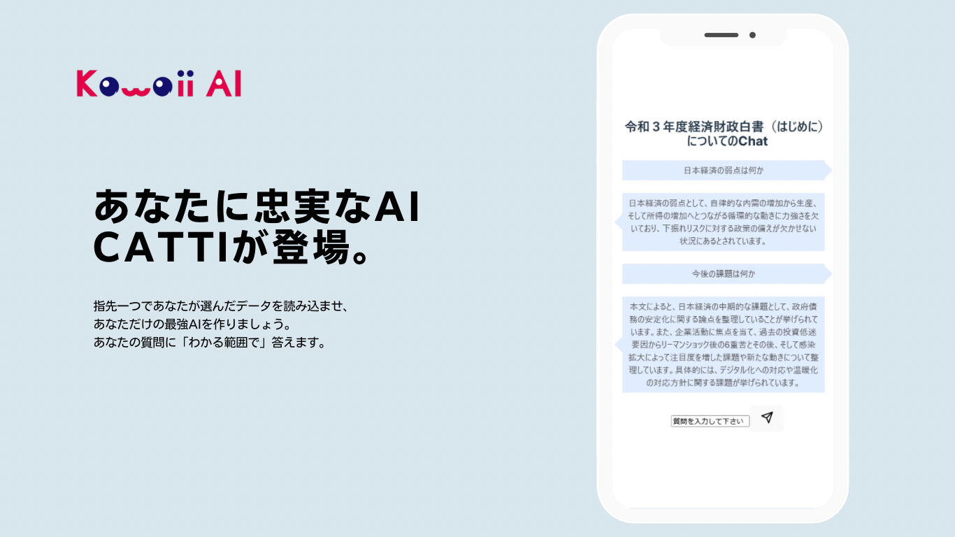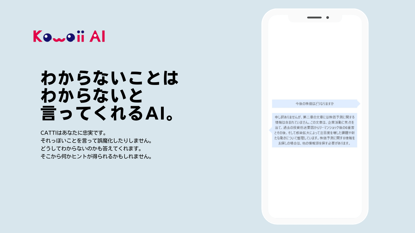CATTIは、「Comprehensive and Accurate Technology for Trustworthy Information」の接頭語であり、嘘をつかないことに努め、わからないことはわからないと言うことをコアコンセプトとしています。株式会社Kawaii AIは、誠実さと透明性を追求したCATTIを通じて、ユーザーの皆様に信頼性の高いAI体験を提供することを目指します。