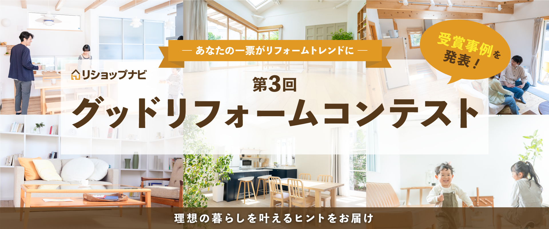 「リショップナビ グッドリフォームコンテスト」は、「次世代のリフォーム体験の創出」のために、厳格な加盟審査をクリアしたリフォーム会社をオンラインでご紹介する国内最大級のリフォーム会社マッチングサービス「リショップナビ」が運営するコンテストです。第3回となる本コンテストは、施工価格帯を500~1,000万円と1,000万円以上に分け、2部門計20のノミネート事例を選出。事務局が約3,800社の加盟店から暮らしをより良くする魅力的な施工事例を選出し、このたびノミネート事例からオンライン一般投票によって各グランプリ・準グランプリが決定しました。
