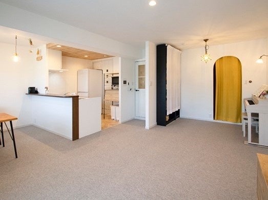 ・事例詳細:マンションの床・壁・天井をすべて取り払ったスケルトンリフォーム。躯体のみの状態にして間取りから作り直す大掛かりな工事だが、排水管などにも手を加えられるため、通常のリフォームでは難しい水回りの変更や移動が可能に。広々としたLDKに間取り変更し、キッチンの向きも変更。