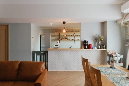 ・事例詳細:魅せる壁面収納は、あえて背板を設けずオープンなスタイルで。床はペットの犬が滑りにくい仕様にし、安全に配慮。アクセントとしてあえて床材を斜めに張り、キッチンカウンターの腰壁にはタイルをヘリンボーンに貼ってデザイン性にもこだわった。