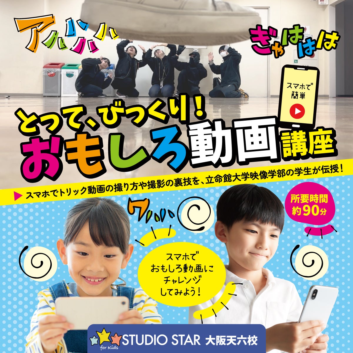 スマホでトリック動画の撮り方や撮影の裏技を、立命館大学映像学部の学生が子どもたちに伝授!